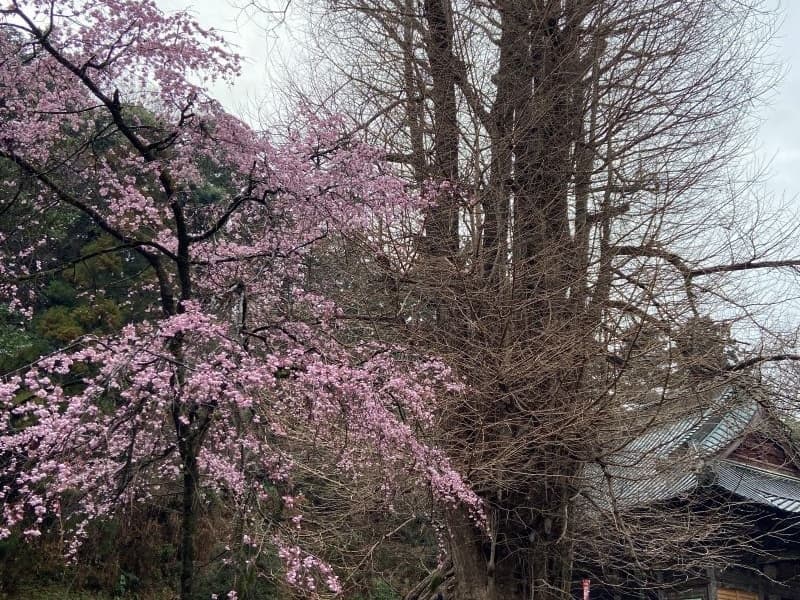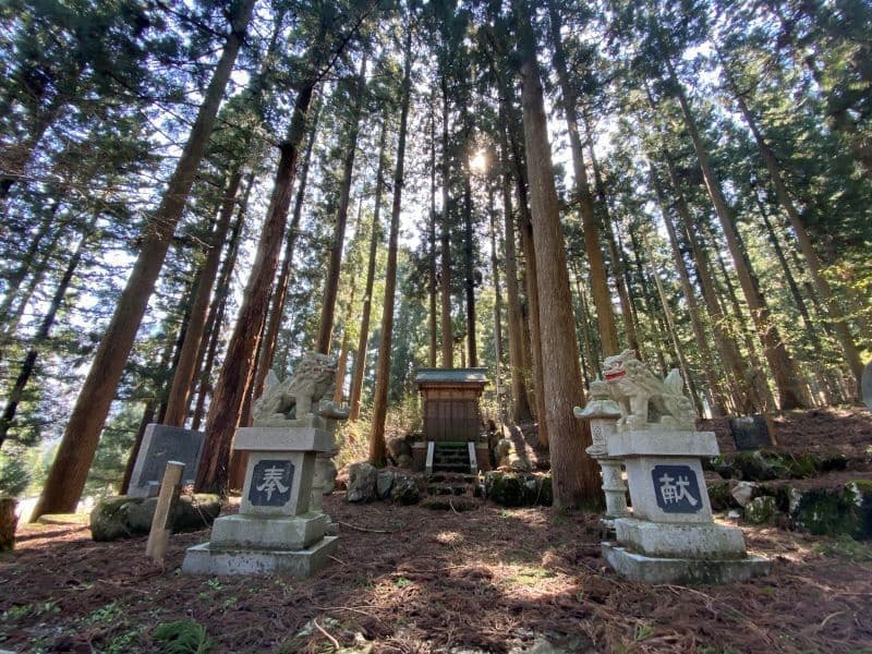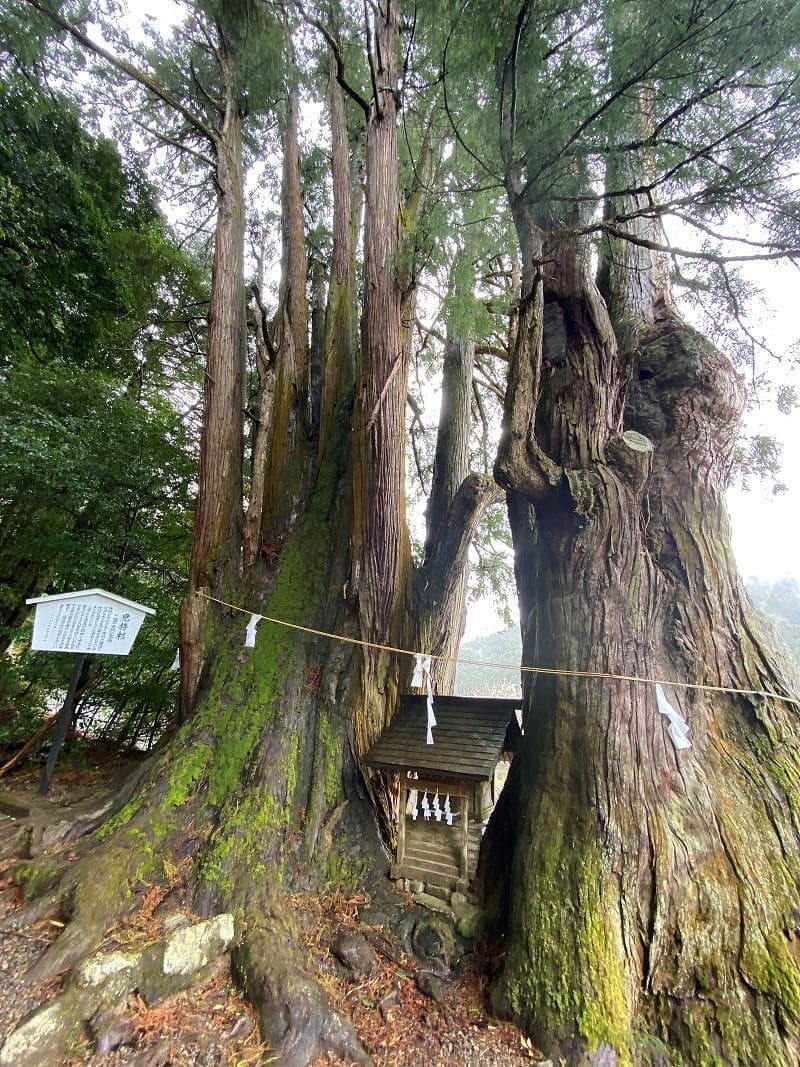面積の約7割を山林が占めるという「木のくに」埼玉県ときがわ町は「巨木の里」として知られ、今回はこの萩日吉神社の鳥居の横にそびえ立つ児持杉(樹齢推定八百年)を師匠と訪れました。児持杉は男杉と女杉からなり、子授けのご利益で知られます。