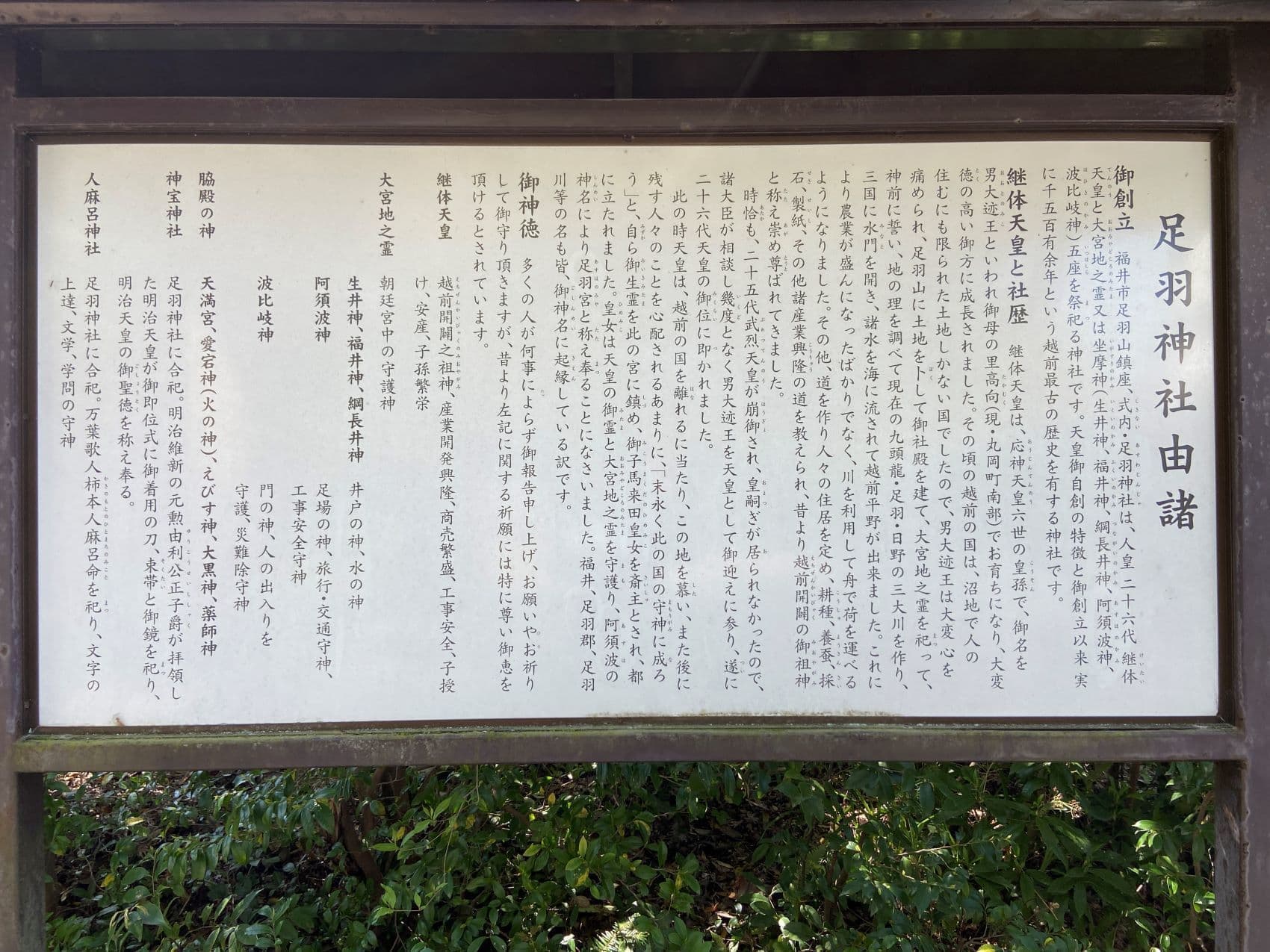福井県神社庁のサイトによれば「御神体は、足羽山上の継体天皇御神像を笏谷石で彫刻し安置して区民の氏神とした」とあります。