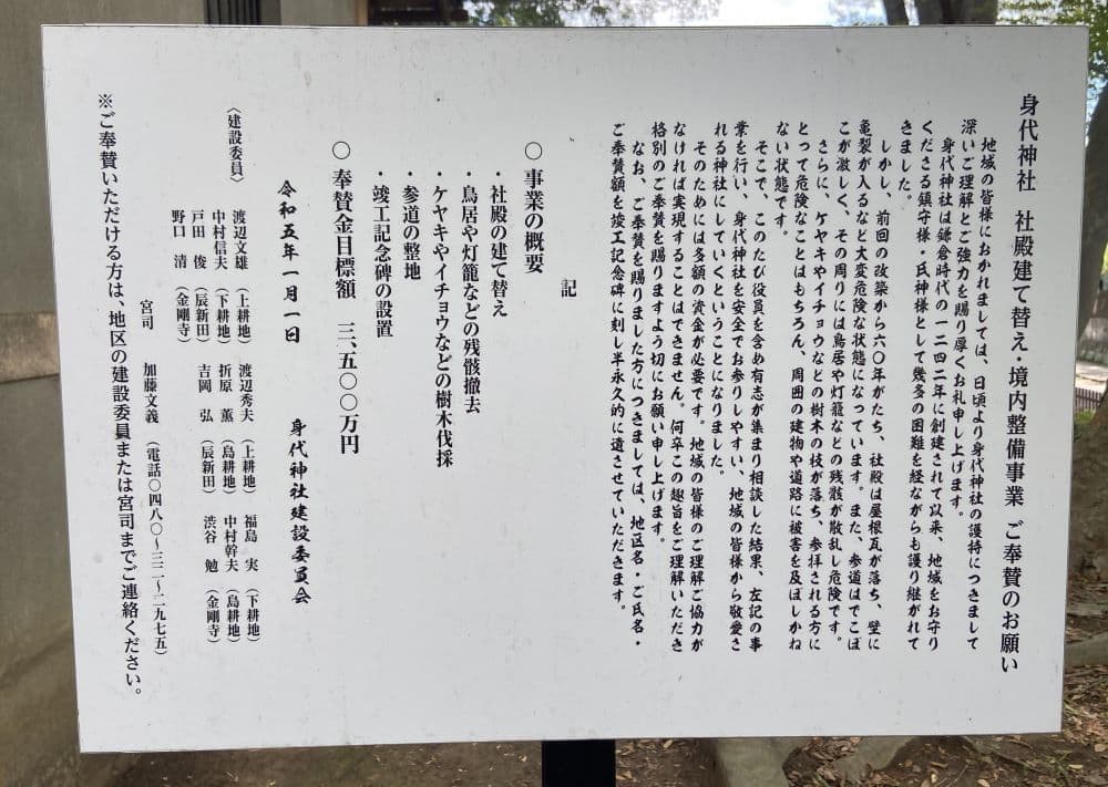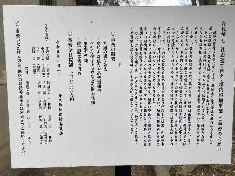 身代神社(このしろ神社)は荒れていましたが、社殿建て替え準備中のようでした。創建は鎌倉時代の1242年。
