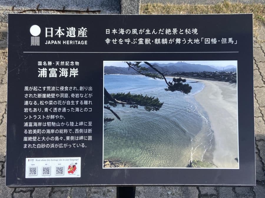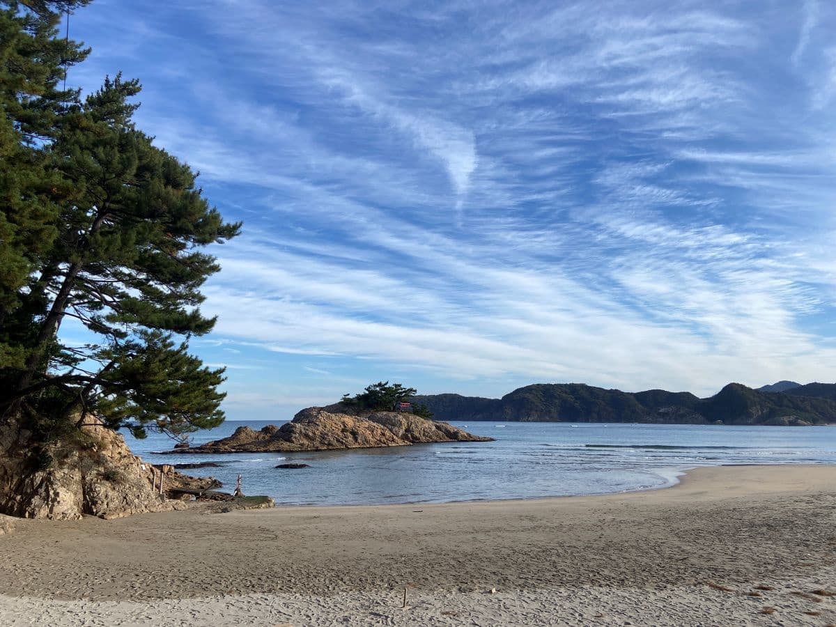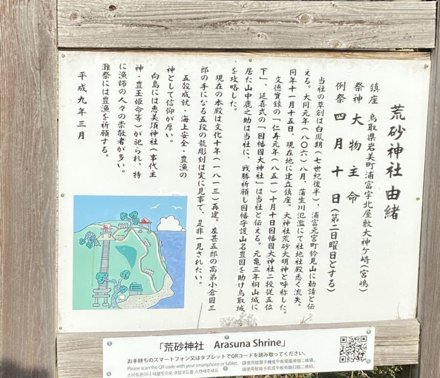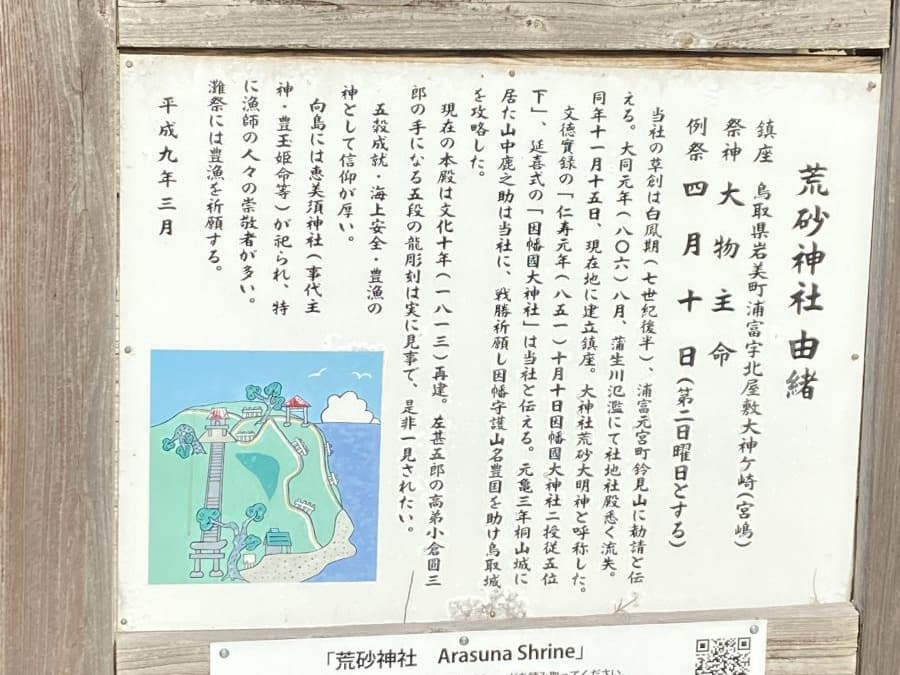 山中鹿之助が鳥取城攻めの際に、戦勝祈願を行ったという荒砂神社は山陰海岸国立公園・浦富(うらどめ)海水浴場の砂浜横(大神が崎)にある岩場の上に鎮座。